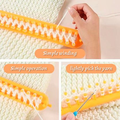 4x pribor za pletenje u raznim veličinama, 1x vješalica za skidanje gotovog proizvoda, 2x igle, 1x upute