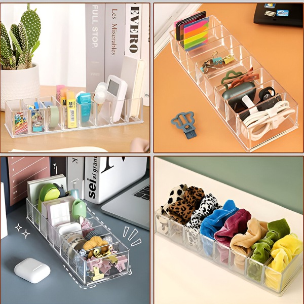 ORGABIN-ove uklonjive pregrade omogućuju vam stvaranje većih ili manjih pretinaca, ovisno o vašim potrebama. Bilo da se radi o glomaznim dodacima ili sićušnim kablovima, prozirni i izdržljivi PET materijal osigurava da su vaši predmeti uredno pohranjeni i da ostanu vidljivi u svakom trenutku.