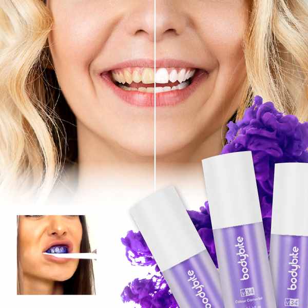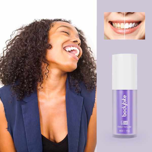 V34 koristi tehnologiju korekcije boje kako bi vidljivo poboljšao bjelinu vašeg osmijeha. Budući da je ljubičasta komplementarna boja žutoj, formula pomaže uravnotežiti neželjene žute tonove za ujednačeniji i blistaviji izgled. Rezultat je trenutno svježiji osmijeh — bez grubih tretmana ili kompliciranih koraka.